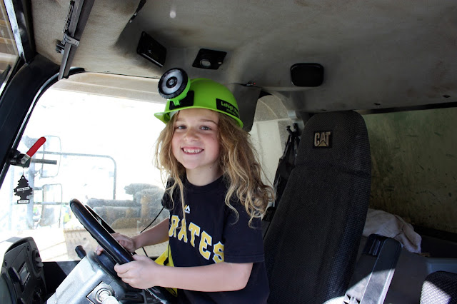 Next, Susie and the rest of the class climb aboard a massive CAT 775F rock truck, where they honk the horn and pose for photos.